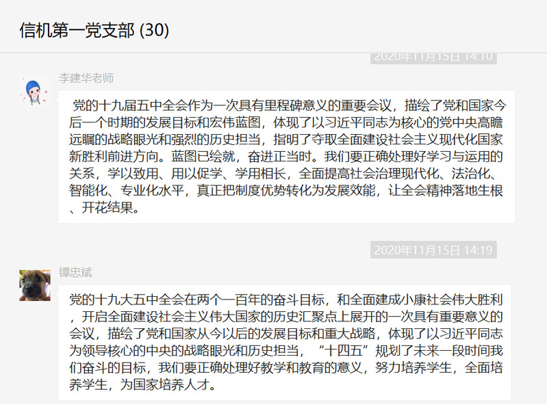 党总支书记刘群:党的十九届五中全会是站在“两个一百年”奋斗目标的历史交汇点上召开的一次重要会议,作为一名思政工作者来说,在做党务工作和学生思想政治教育工作中,引导学生从自身做起,要理直气壮做好大学生思想工作,用习近平新时代中国特色社会主义思想去铸魂育人,引导学生践行“做人,做事,做学”的校训,通过组织丰富多彩的活动,融合校园环境的各种育人元素,培育既具有学校办学特色又全面发展的社会主义事业的可靠接班人和建设者。