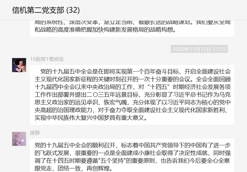 学生党支部书记胡婉君:五中全会对文化建设高度重视,从战略和全局上作了规划和设计。其中,最重要的,就是明确提出到2035年建成文化强国。这是党的十七届六中全会提出建设社会主义文化强国以来,党中央首次明确了建成文化强国的具体时间表。这对我们高校工作者来说,是一个挑战,是一个机遇,我们要好好学习五中全会的精神,在这条路上走下去。
