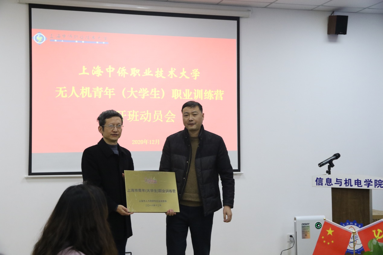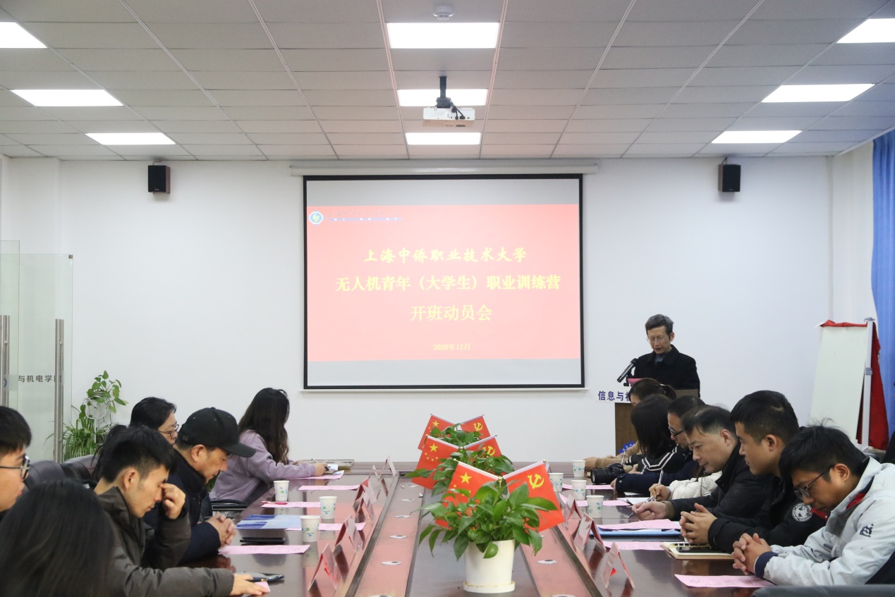 2020年12月16日(周三)12:00,无人机青年(大学生)职业训练营开班动员会在9号楼306会议室举行,出席此次活动的嘉宾有金山区就业促进中心副主任褚伟兵、 职介副科长胡春芳、上海裕芮信息技术有限公司副总经理李益明、培训部主任蔡茂森,校方代表有上海中侨职业技术大学副校长罗宁、信息与机电学院党政领导班子,学院教师及部分青训营学员代表,大会由信息与机电学院党总支书记刘群主持。