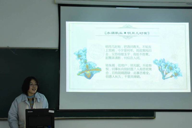 首先,由胡妮妮同学带同学们朗诵了词人苏轼的《水调歌头·明月几时有》,而后由苏雪滢同学为同学们讲解鉴赏《水调歌头·明月几时有》,她对诗词逐句分析,析词解字,将《水调歌头·明月几时有》讲解得细致入微,感受到作者浓浓的思念。