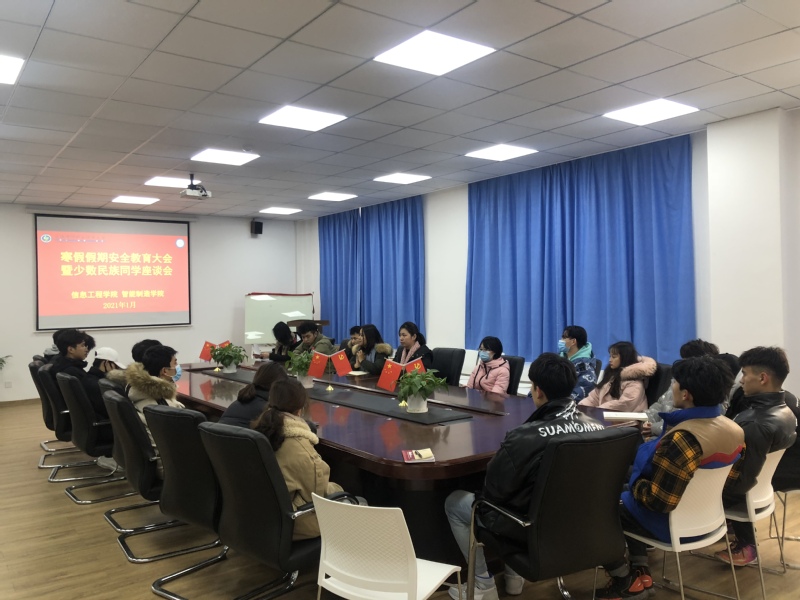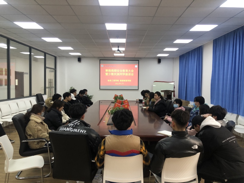 为进一步强化加强少数民族学生教育和管理,增强学生法制观念,提高学生安全防范意识和能力,确保学生过一个和谐祥和的寒假。1月8日中午,信息工程学院、智能制造学院召集学院少数民族学生于9号楼306会议室召开学生座谈会暨寒假安全教育大会。学院党总支书记刘群,相关辅导与以及20余名少数民族学生参加会议,会议由少数民族学生辅导员孜拉吉古丽•热依木老师主持。