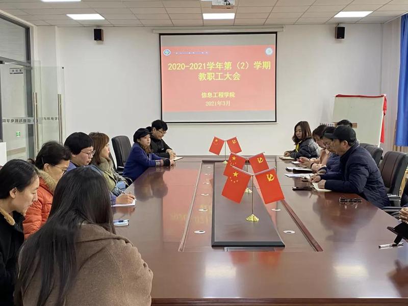 三月草长莺飞,正是春光明媚好时节。信息工程学院于2021年3月 3日中午12:00 ,在9-306会议室召开2020-2021学年第(2)学期全体教职工大会,开启了新学期的扬帆启航。会议由信息工程学院党总支书记刘群主持,院长陈祖爵、副院长赵欣、副院长魏鹏出席了本次会议,学院全体教职工参加了本次大会。