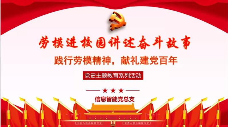 建党百年之际,为了大力弘扬劳模精神、工匠精神,引导大学生崇敬劳模、学习劳模,崇尚劳动、热爱劳动,让劳模精神成为广大青年成长、成才的精神动力,充分发挥劳模精神,贯穿学院人才培养的全过程。信息智能党总支开展建党百年,劳模进校园讲述“匠心梦”主题教育活动,带领师生们一起感悟感受劳模工匠的奋斗故事。