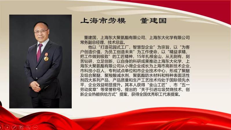董建国,上海东大聚氨酯有限公司、上海东大化学有限公司常务副总经理、技术总监。其本人获得“金山工匠”,市“五一劳动奖章”等荣誉称号。提出的“关于引进垃圾焚烧技术、创新企业热能供给方式”提案,获得全国优秀职工代表提案。