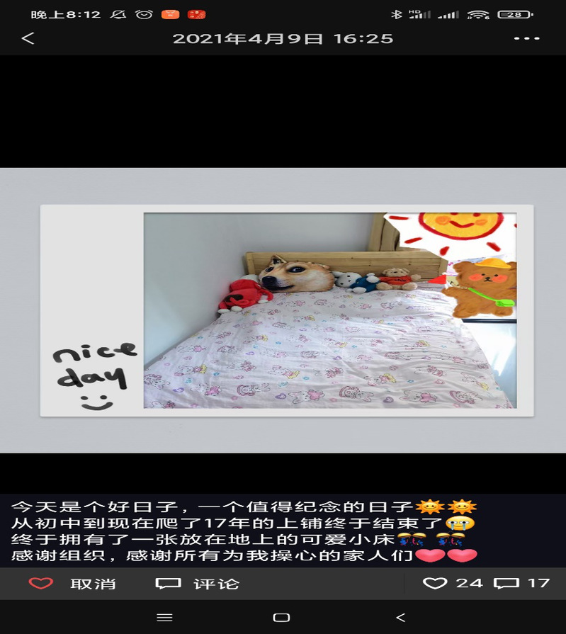 其中一位辅导员目前怀孕3个月,目前和学生住在同样的寝室,宿舍内的床还是高低床,前期因为床位紧张一直没有反馈,现在月份越来越大担心爬上趴下影响生命安全,会后,罗校长联系了分管的后勤部门,联系协调床铺,同时在过程中及时跟进情况,第二天年轻的辅导员告别了商铺,满心欢喜的住到了下铺的床上,她感慨到“今天是个好日子,一个值得纪念的日子,从初中到现在爬了17年的上铺终于结束了,终于拥有了一张放在地上的小床,感谢组织,感谢为我操心的领导们”,对罗校长的感恩之情溢于言表。