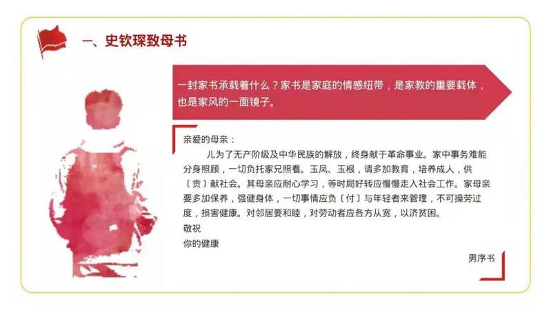 这一封封真挚的家书,让我动容,泪湿眼眶。在那段岁月长河中,先辈们舍生忘死,舍小家为大家,抱着一颗对祖国的拳拳之心,保护国家,保护山河。作为一名新时代的党员,更应该努力奋斗,为中华民族的伟大复兴尽自己的一份力量。