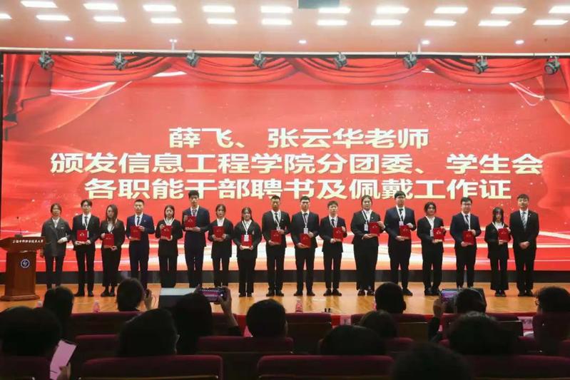 信息工程学院分团委学生会书记薛飞老师宣读2021-2022信息工程学院分团委·学生会职能干部名单并与辅导员张云华老师一起颁发聘书及佩戴工作证。辅导员张玉老师宣读2021-2022学年信息工程学院各部门干事名单。