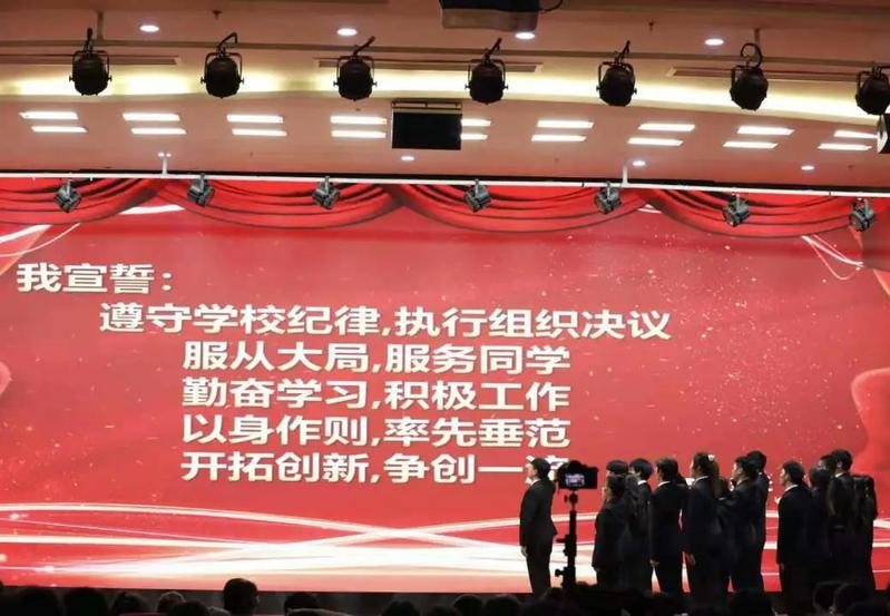 紧接着由信息工程学院分团委学生会书记薛飞老师带领新任主席团和分团委学生会职能干部进行任职宣誓。庄严宣誓后,新任信息工程学院分团委·学生会执行主席杨倩慧同学上台发言,她希望院学生会的新成员可以努力地增强自身责任感和使命感、积极主动地开展工作,把同学们紧紧团结在一起,促进学生会的工作。