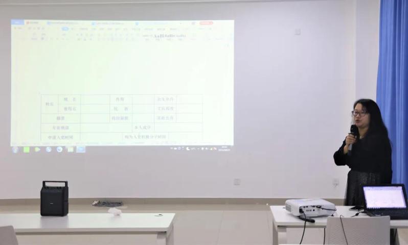 首先,由胡婉君老师向同学们介绍入党流程,入党积极分子进行初党学习,之后由学校筛选进入中党,进行考试,考试通过则进入校委学习,升入高党,根据平时的表现推选为中共预备党员,并积极转正。