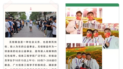 当然,我们信息工程学院学子也发挥了模范作用,弘扬了奉献精神,为同学们树立了好榜样,相继开展了志愿献血活动,“小叶子”分享“进博会”感想等,传递青春正能量!