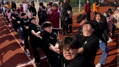 随之,信息工程学院的同学们也不甘示弱,第一场是信息工程学院与外国语学院进行比拼,他们纷纷抓住了绳子并做好准备,随着老师的一声哨响,每位学生都用尽全部的力气往后拉,一旁的同学们也在为他们加油鼓劲,在同学们的不断努力下,第一场比赛赢得了胜利,队员们开始欢呼。