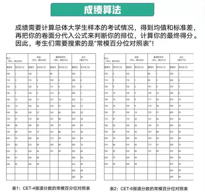 四六级分数采用常模计算法。每次考试等值后的卷面分数都参照常模转换为报道分。成绩需要计算总体大学生样本的考试情况,得到均值和标准差,再把你的卷面分代入公式来判断你的排位,计算你的最终得分。因此,考生们需要搜索的是“常模百分位对照表”!