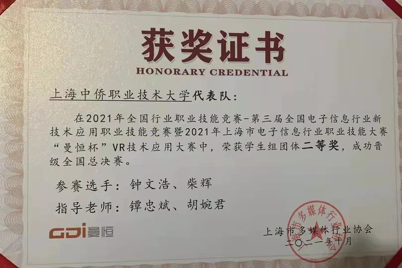 在2021年全国行业职业技能竞赛—第三届全国电子信息行业新技术应用职业技能竞赛暨2021年上海市电子信息行业职业技能大赛“曼恒杯”VR技术应用大赛中,由信息工程学院参赛学生钟文浩、柴辉和指导老师镡忠斌、胡婉君老师组成的上海中侨职业技术大学代表队荣获学生组团体二等奖,成功晋级全国总赛!