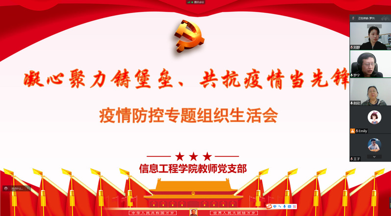 为了进一步深化认识,坚定信心,切实把疫情防控的各项工作抓实抓细抓落地,积极发挥党组织的战斗堡垒作用。3月12日下午19:00至20:00,信息工程学院教师党支部通过腾讯会议在线召开了“凝心聚力铸堡垒、共抗疫情当先锋”主题党日活动。副校长罗宁以及全体党员教师参加,本次活动由党支部书记赵欣老师主持。