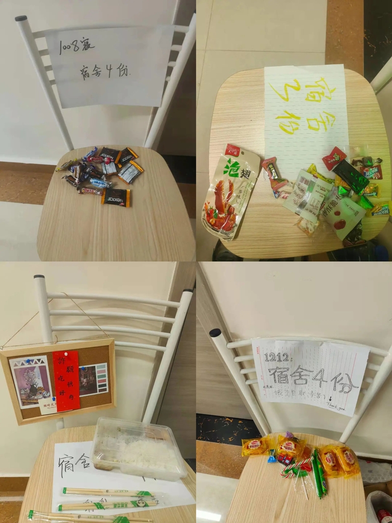 这一群可爱又暖心的志愿者们用自己的力量温暖着所有人的心田。寝室门口的零食、用心书写的话语都是对他们尽职尽责志愿的感谢。