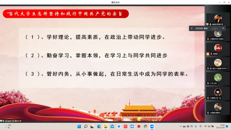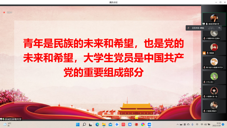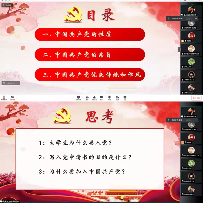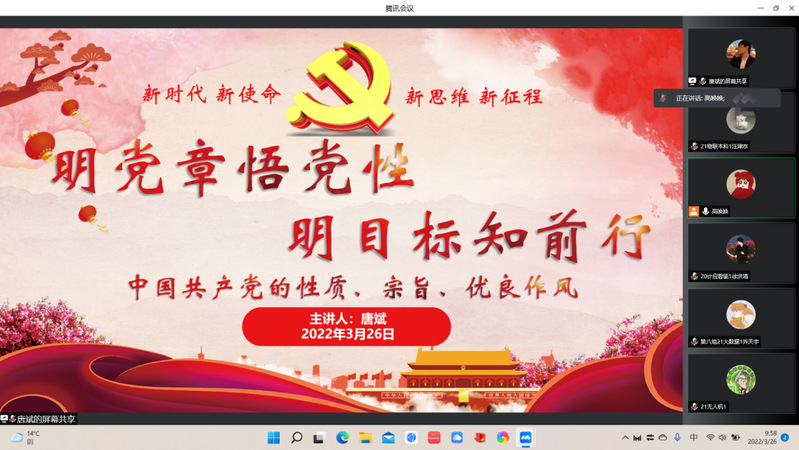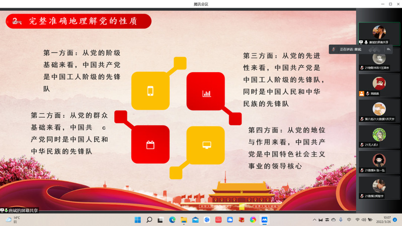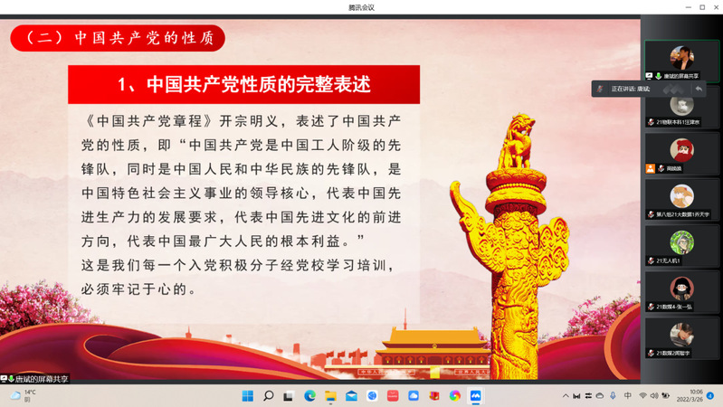 为加强入党积极分子对党的认识,提高党性修养,深化党的宗旨,培养全面发展的社会主义建设者和接班人。第四分党校于2022年3月26日上午10:00线上开展第十一期中级党课第四讲。本次党课由信息工程学院党总支副书记唐斌主讲,主题是“明党章悟党性,明目标知前行”。