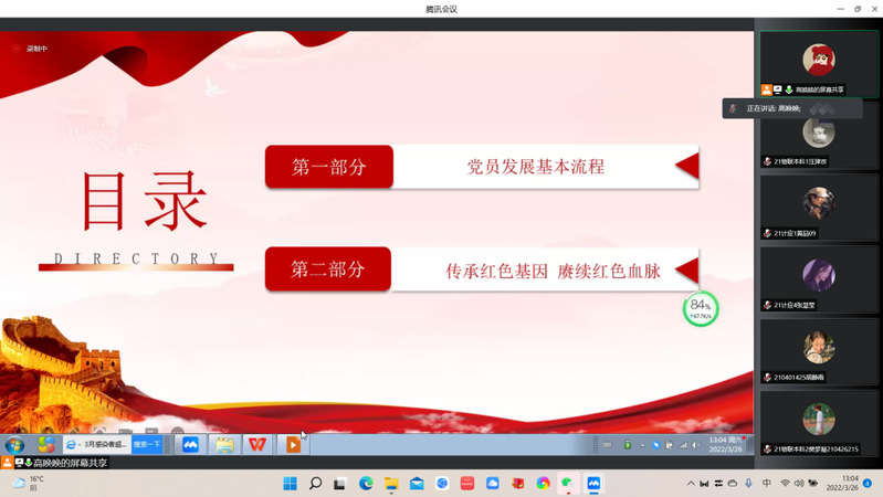 为入党积极分子将来成为一名党员打下基础,同时也为加深入党积极分子对党员发展流程的认识,形成正确入党动机,更好地理解红色基因,第四分党校于2022年3月26日下午13:00在线上开展党课第五讲。本次党课由信息工程学院学生党支部书记郑敏老师主讲,主题是《知党员发展流程,激活红色基因》。