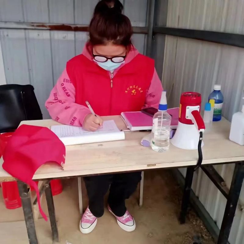 我们一共有五名志愿者,都在尽自己的微薄之力。社区给我们安排的工作就是每天都卡点值班,登记好外来车辆和人员的信息。每一辆外来车辆我们都要检查他们的健康码和行程码,一旦发现异常就要上报并且劝返。过年时候从外地回来的人员也比较多,我们要清楚地统计每一个返乡人员的健康信息。还有一些不认字、不会使用老年机的老人,我们不仅要耐心地给他们讲解,而且也要嘱咐他们一定要居家隔离,不能外出。由于返乡人口的数量较多,我们社区还安排每人每周必须要做三次核酸,基本上是两天一次。社区的干部年龄都比较大了,基本上是我们志愿者帮忙做一些核酸需要的工作。医护人员也能力有限,我们志愿者在现场就维护秩序,帮忙扫码。每个人都在尽自己力量守护一方平安。