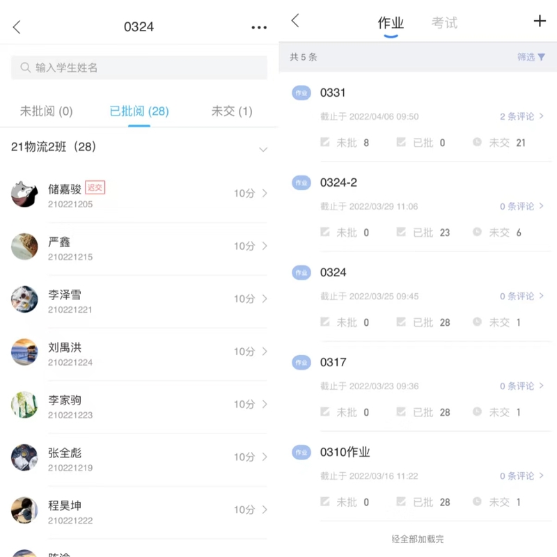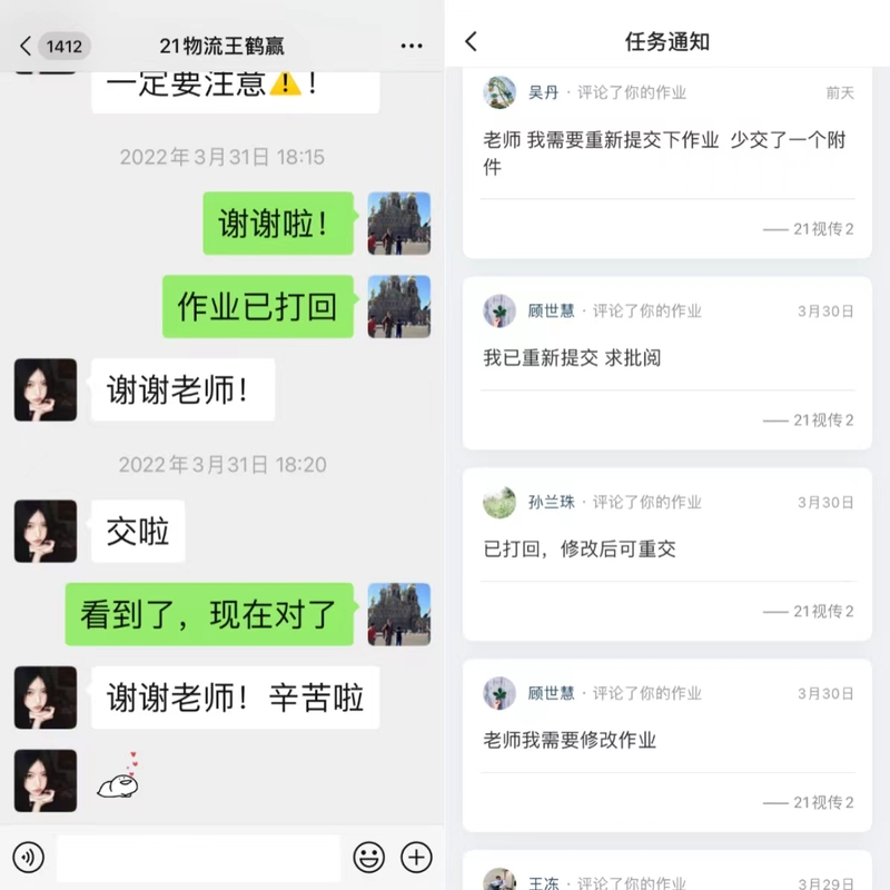 学生通过智慧树班级提交作业,每次作业都会进行批阅和讲评,有错误愿意重做的就给打回作业,只要会做、做对了,教学目的就达到了,对自己来说也有了成就感,很开心。交作业率为90%以上。
