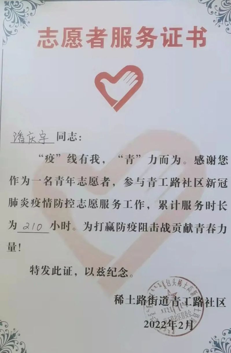从家乡疫情开始一直到疫情得到有效控制,我在这次的志愿服务中总共工作了210小时,每天早上五点一直到下午五点,当然有时根据情况不同,时间会有所延长。经过这次的志愿服务,我真正的体会到了每一个“大白”的不易,让我印象最深的即是每次的核酸检测都需要对每一栋每一户的不同情况要有所统计,所以那段时间协助统计时我们几个人都要守着电脑好久,统计好后第二天又要很早就起来继续维护核酸检测的秩序。但其中医务人员才是最辛苦的,不仅要在我们这个小区忙碌,他们还要去其他小区持续地工作,那段时间内蒙的天气真的很差、很冷,有时短暂休息我都能看见他们的手被冻得通红。我也真切的体会到那句我们常听到的“哪有什么岁月静好,不过是有人在负重前行”,疫情当前,我们每一个人都有责任和义务积极抗疫。在一线的医务人员和其他工作人员是最值得我们敬佩的英雄!