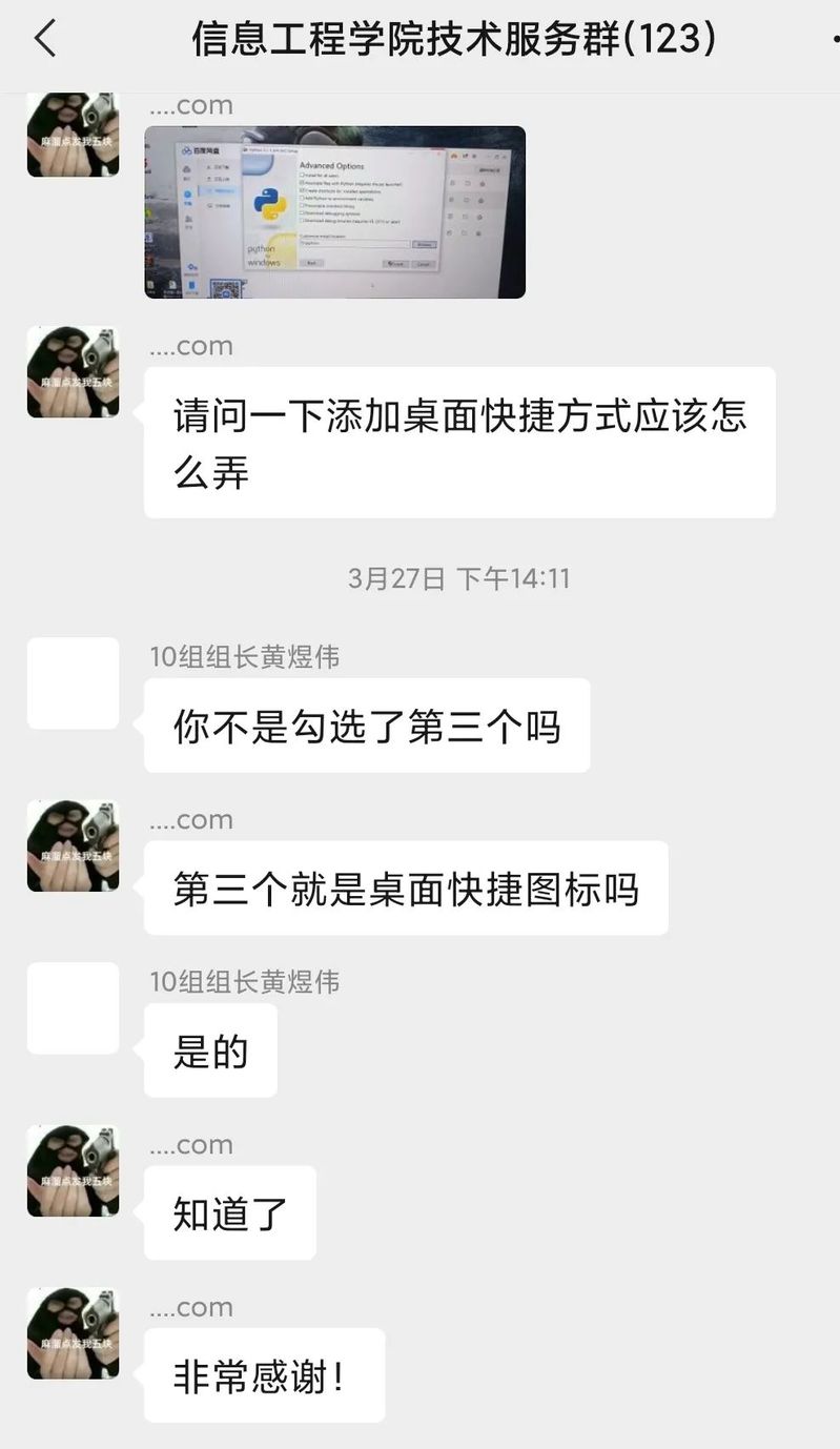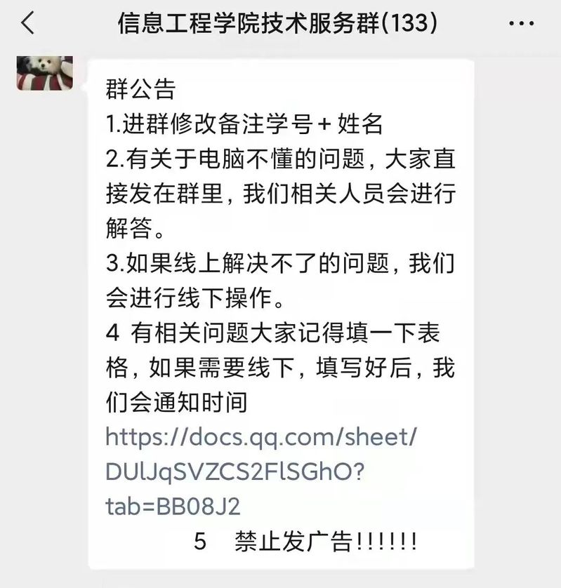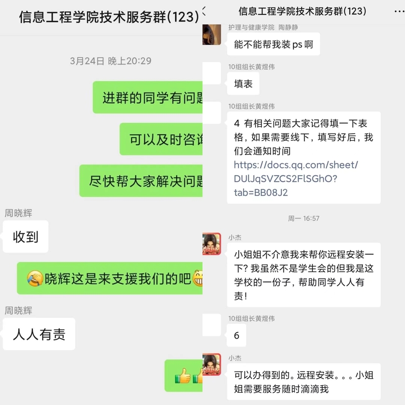 志愿者们采用线上服务方式,建立“信息技术服务需求群”,与需要帮助的老师同学们进行线上沟通,同学们在群里询问问题,志愿者积极为其解决。志愿者们在活动中热情耐心、“有求必应”,遇到问题积极协商,合理解决,对于线上不能解决的问题,通过预约的形式进行线下安装指导服务。