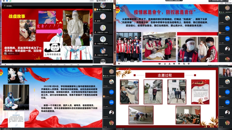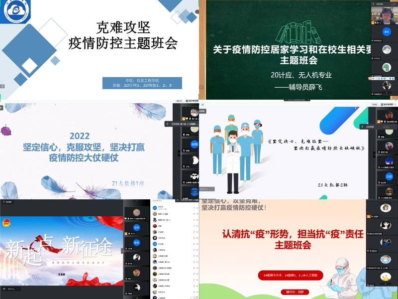 针对近期上海疫情呈现快速发展的态势,全市面临常态化以来最严峻的挑战。为贯彻落实上级各部门的统一要求,信息工程学院各班于4月9日至10日展开“坚定信心、克难攻坚,坚决打赢疫情防控大仗硬仗”的疫情防控线上主题班会。辅导员全面详细地传达了疫情防控工作安排和要求,对重要内容做了深入说明。同学们也全数参与,学习并聆听着自己班级同学的战“疫”故事。