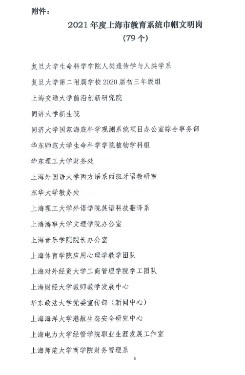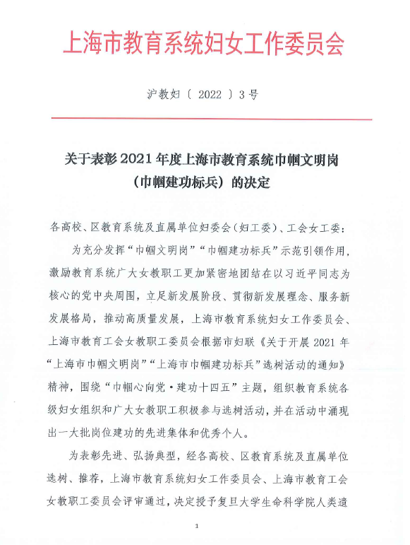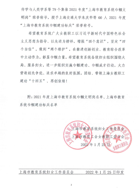 为充分发挥“巾帼文明岗”“巾帼建功标兵”示范引领作用激励教育系统广大女教职工更加紧密地团结在以习近平同志为核心的党中央周围,立足新发展阶段、贯彻新发展理念、服务新发展格局,推动高质量发展,上海市教育系统妇女工作委员会、上海市教育工会女教职工委员会根据市妇联《关于开展2021年“上海市巾帼文明岗”“上海市巾帼建功标兵”选树活动的通知》精神,围绕“巾帼心向党·建功十四五”主题,组织教育系统各级妇女组织和广大女教职工积极参与选树活动,并在活动中涌现出一大批岗位建功的先进集体和优秀个人。在此次评选中,上海中侨职业技术大学信息工程学院的计算机基础教研室喜获“2021年度上海市教育巾帼文明岗”。