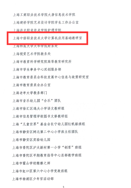 计算机应用基础课程荣获上海市精品课程。教学团队致力培育学生的职业理想与职业技能。在教学过程中把与社会主义核心价值观相关的内容融入大学信息技术课程,将职业技术、专业知识转化对创新的进取之心,引领学生健康成长。