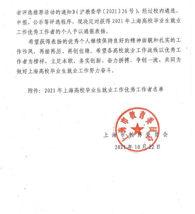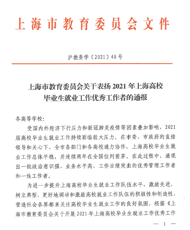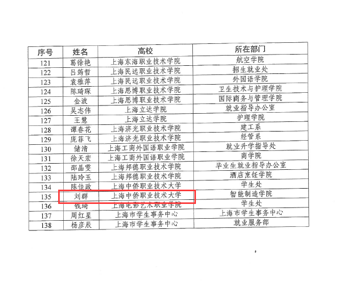 受国内外经济下行压力和新冠肺炎疫情等因素叠加影响,2021届高校毕业生就业工作持续面临较大压力。在市委、市政府的直接领导和关心下,全市各部门和各高校通力协作,上海高校毕业生就业工作总体平稳,并连续两年在全国位列前茅。在此过程中,涌现出一批政治意识强、业务水平高、工作业绩突出的优秀管理工作者和一线工作者。根据《上海市教育委员会关于开展2021年上海高校毕业生就业工作优秀工作者评选推荐活动的通知》(沪教委学〔2021]36号),经过校内遴选、申报、公示等评选程序,上海中侨职业技术大学刘群老师荣获 上海市高校毕业生就业工作优秀工作者称号。