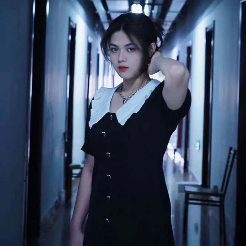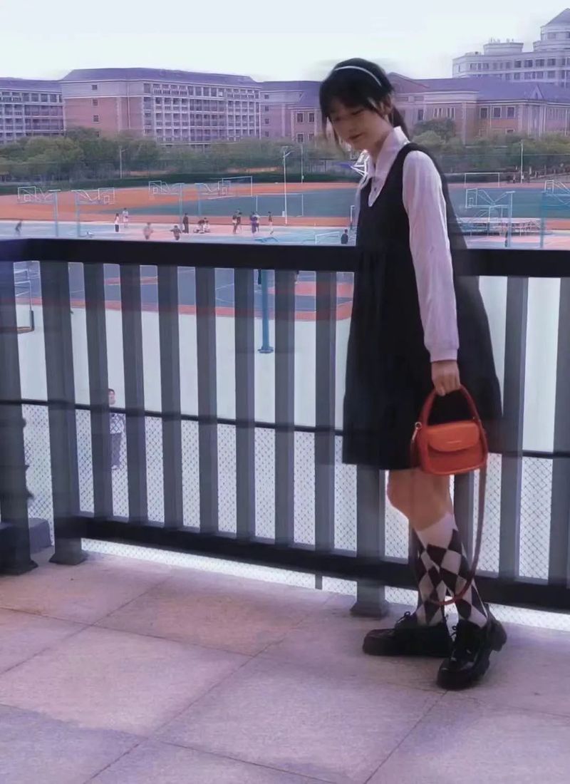 灰色内搭加上深蓝长裙 整体活泼、温雅 金色阳光洒在头发上 视觉清新脱俗带来青春气息 黑色娃娃裙搭配传统白衬衫 不仅不显单调 反而与其棋盘格长袜交相呼应 搭配红色手提包 彰显活力又凸显文艺范