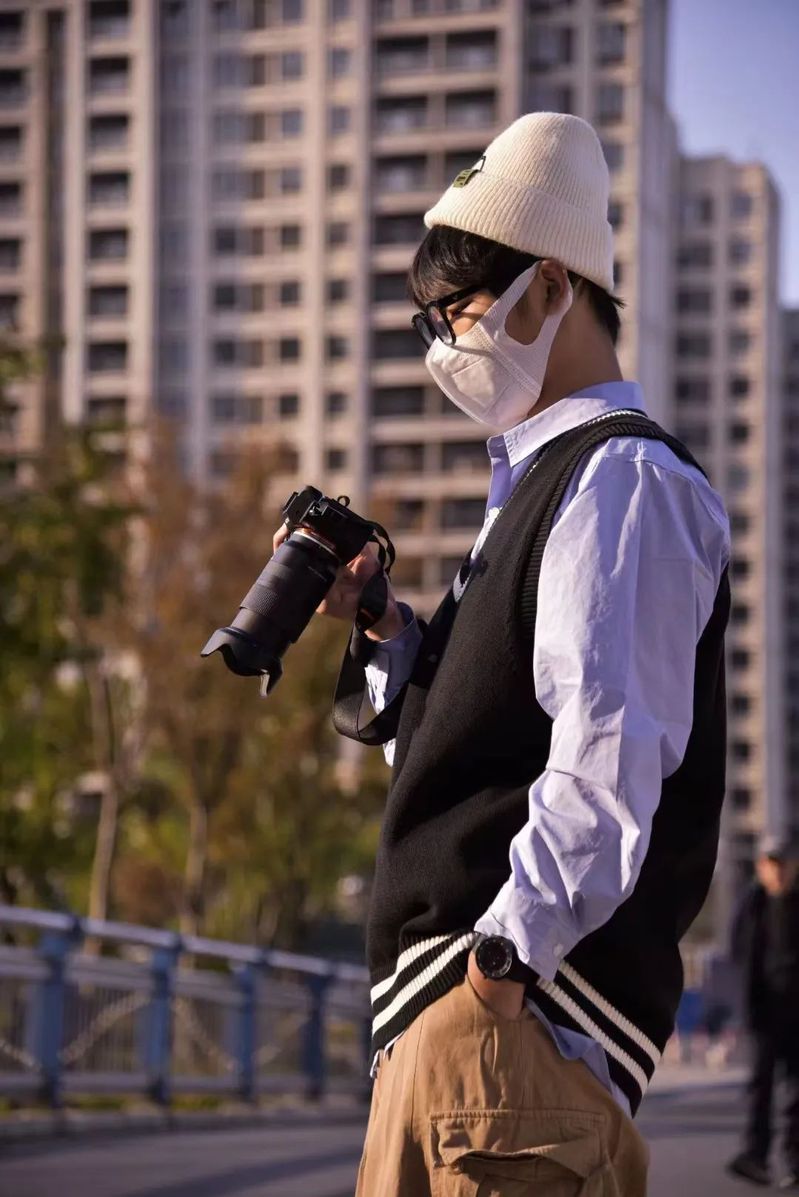 蓝色衬衫加上黑色马甲 大胆的撞色让人眼前一亮 搭配卡其色休闲裤 满满的学院风 黑色边框眼镜用来装饰 展现青春活力