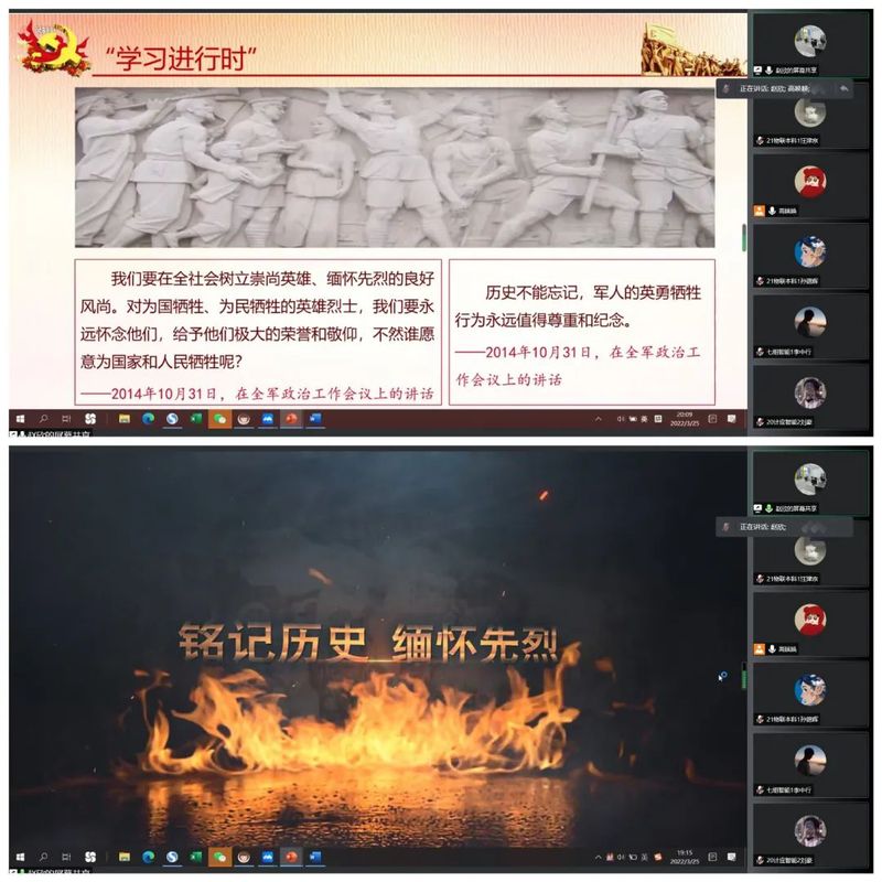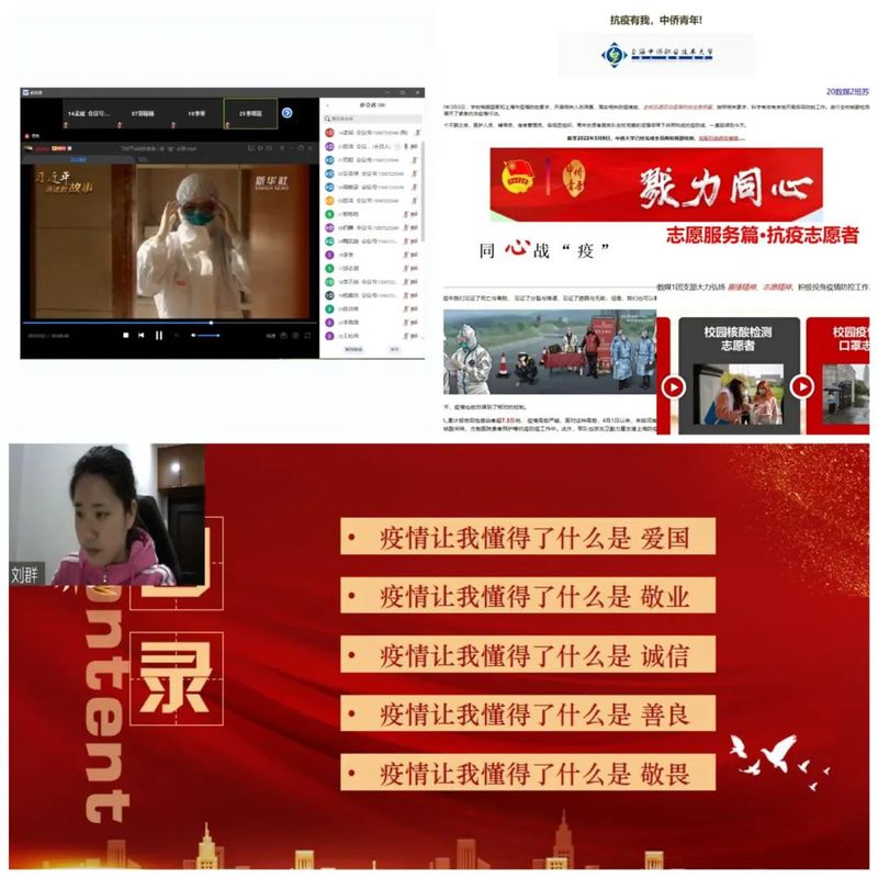 举办“读党史,忆初心”读书学习等活动,打牢学生思想基础,做到校园封控管理期间,理论学习不打烊。举办“缅怀革命先烈,英雄忠魂永存”英雄事迹云端分享会,通过讲述英雄事迹,组织“清明祭英烈”主题团日活动,开展党史诗歌朗诵会,朗诵会同学们一起分享了党史相关的诗歌,坚定了红色教育的理想信念,端正了红色追求的人生态度。通过这些方式来感受革命精神在当代的传承。任课教师将抗疫精神融入思政课程中,增强学生抗击疫情的信心。