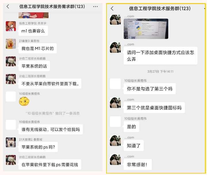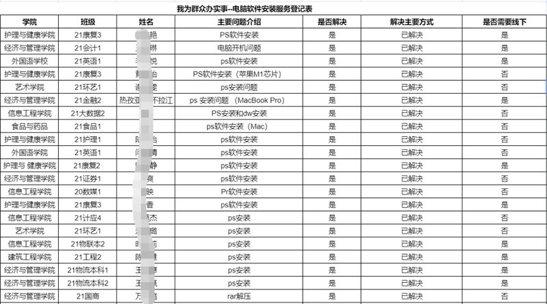开展专业特色志愿服务,成立技术服务志愿队,采用线上服务方式,建立“信息技术服务需求群”,针对来自各个学院的师生遇到的一些ps、pr等软件激活安装、office软件激活等问题进行了解答,“有求必应”,遇到问题积极解决,对于线上不能解决的问题,通过预约的形式进行线下安装指导服务。推动了计算机专业学子发挥专业所长,也让“我为群众办实事”真正深入到日常生活当中,不仅提高了学生运用所学专业知识的动手操作能力和社会实践能力,同时也增强了学生的服务意识。他们用细致入微的关怀和暖心的行动温暖他人,一抹“志愿红”成为了一道最美的风景线。