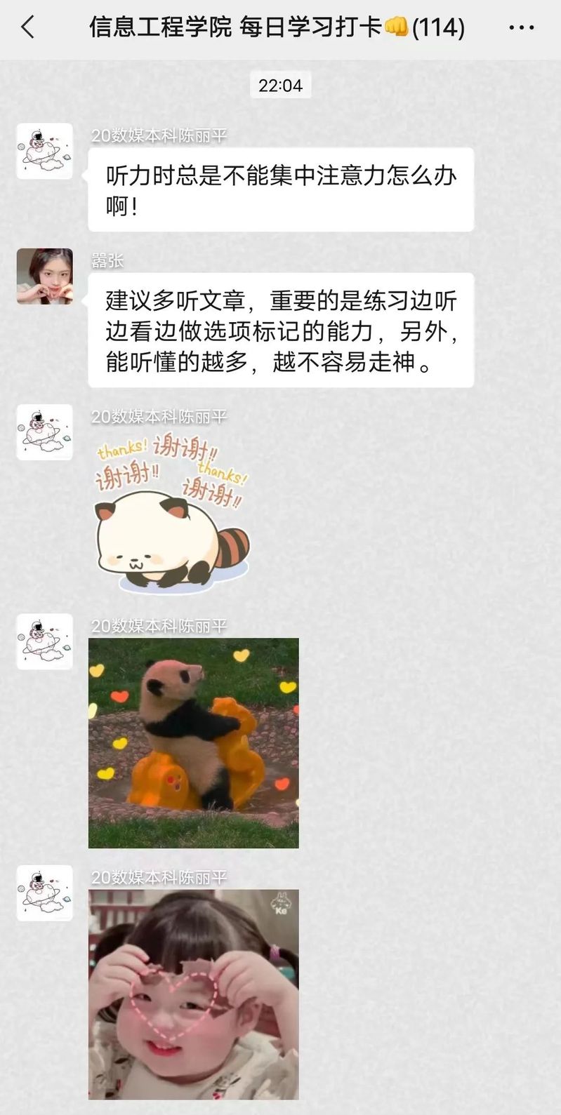 不仅如此,我院还创建活动打卡微信群,群内有考过四六级的学长、学姐们为大家答疑解惑,并有指定同学每天提醒大家按时打卡活动,提醒方式多种多样,比如说早安的问候、歌词的传递、有趣的表情包以及看似毫无关系的语言,实则是细心的提醒。