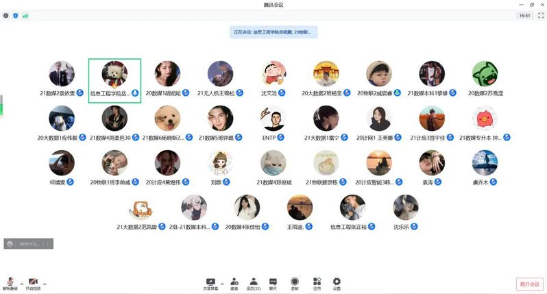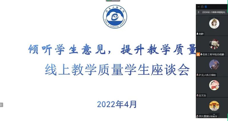 根据学校相关部门工作部署,为进一步辅助提高信息工程学院师生课堂教学质量,了解信息工程学院同学们对于教学工作的意见及建议。4月22日晚7点,信息工程学院分团委学生会组织召开了线上教学督导信息员座谈会,本次会议由信息工程学院分团委学生会主席岳晓鹏同学进行主持,各专业班级学生代表参加此次会议。