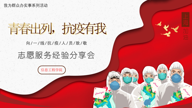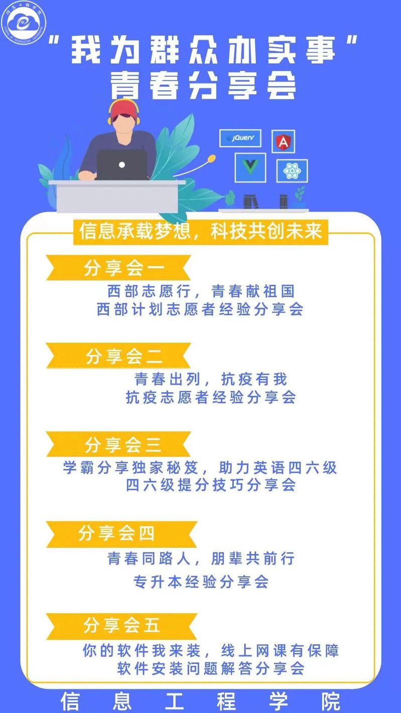 为深入学习贯彻习近平总书记“七一”重要讲话精神,深入开展“我为群众办实事”实践活动,进一步丰富大家网课学习生活。信息工程学院于2022年4月24日开始,陆续开展我为群众办实事系列分享会活动。下面就先让我们一睹为快吧!