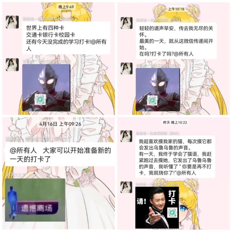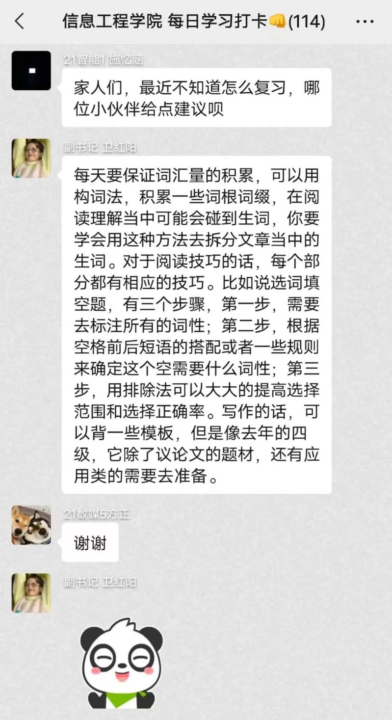 不仅如此,我院还创建活动打卡微信群,群内有考过四六级的学长、学姐们为大家答疑解惑,并有指定同学每天提醒大家按时打卡活动,提醒方式多种多样,比如说早安的问候、歌词的传递、有趣的表情包以及看似毫无关系的语言,实则是细心的提醒。