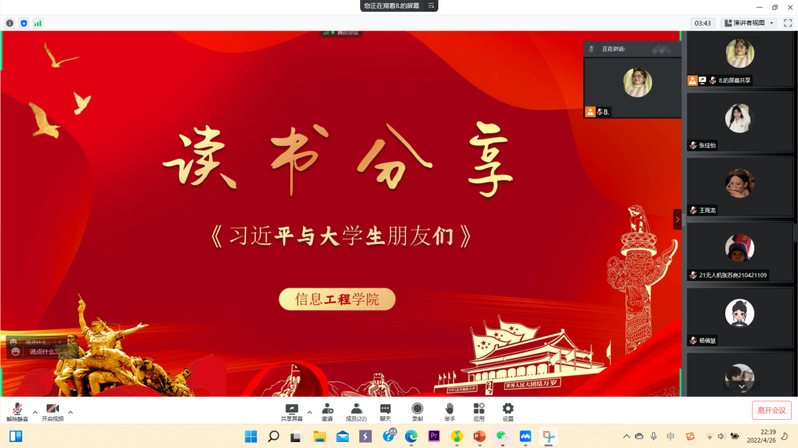 为深入贯彻党的红色文化,丰富同学们的文化底蕴,信息工程学院于4月24日晚6点开展线上读书分享会。本次读书分享会由信息工程学院分团委学生会副书记卫红阳主持,由学院部分同学参加。