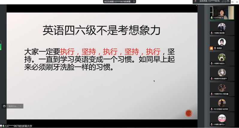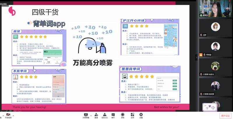 本次分享会在1个多小时后圆满结束,最后信息工程学院执行主席杨倩慧同学表示,希望同学们打好基础,脚踏实地地学习,在四六级考试中获得自己满意的成绩。最终祝愿大家都可以在充分备考后取得优异的成绩!