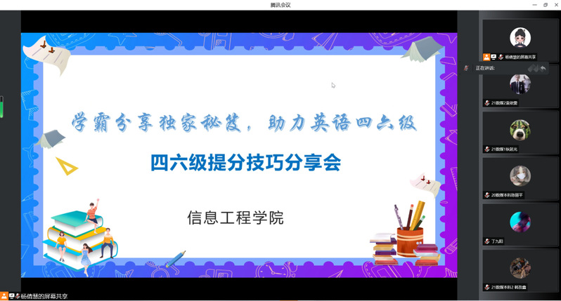 为加强学风建设,传授学习经验,激发同学们的积极性,取得更好的成绩。信息工程学院在5月1日晚6:30召开线上英语四六级提分技巧分享会,由信息工程学院分团委学生会执行主席杨倩慧同学主持,近百位入党积极分子在线倾听。