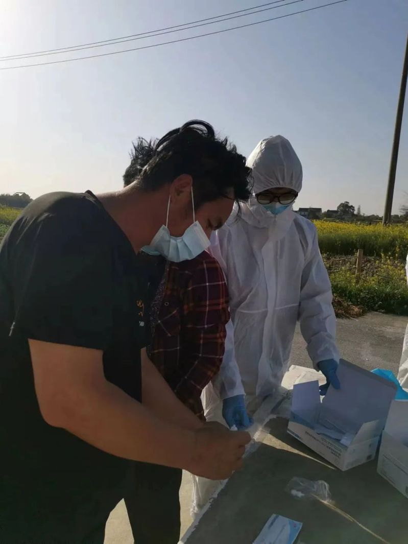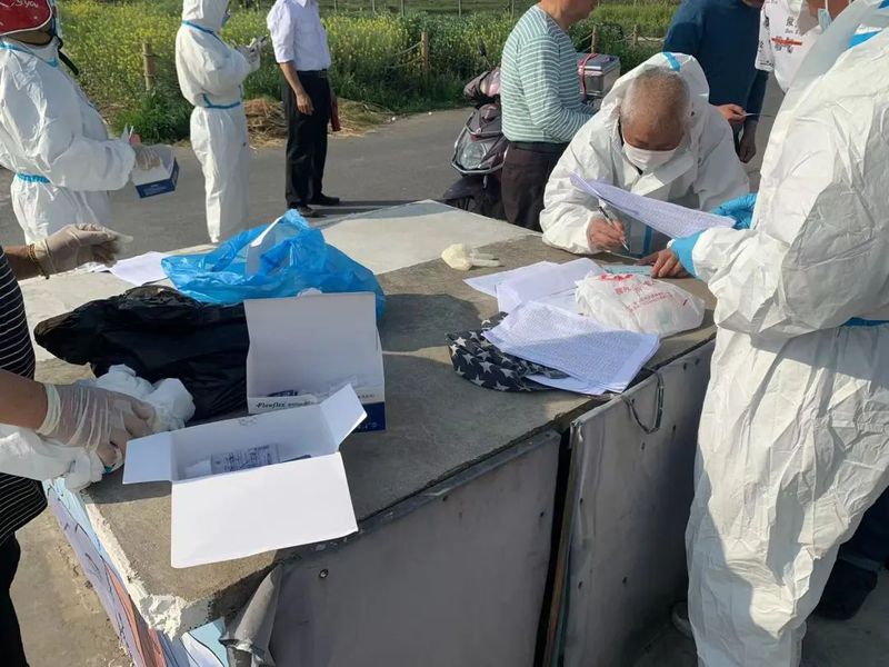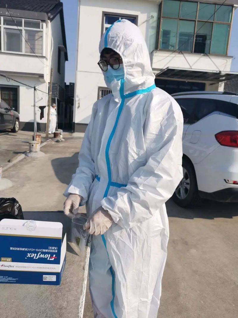 从早上6点开始,我参与抗原检测,按照防疫要求,仔细地换好防护服,领取相应的核酸自检试剂盒,然后2人一组,去相应的地方服务。在服务过程中,我总是耐心地分好自检试剂盒,统计好人数,然后挨家挨户地指导村民做抗原自测。在做完抗原自测后,我会一一检查确保无遗落、无错误并签字确认,然后统计完拿到村里去。在现场,我时常指导不会使用核酸码的人如何使用,并告知村民做好防护。