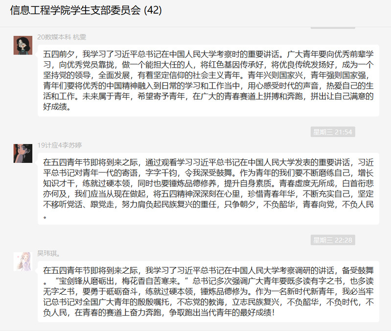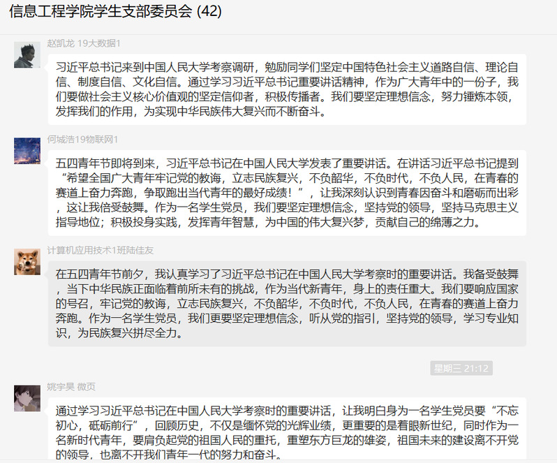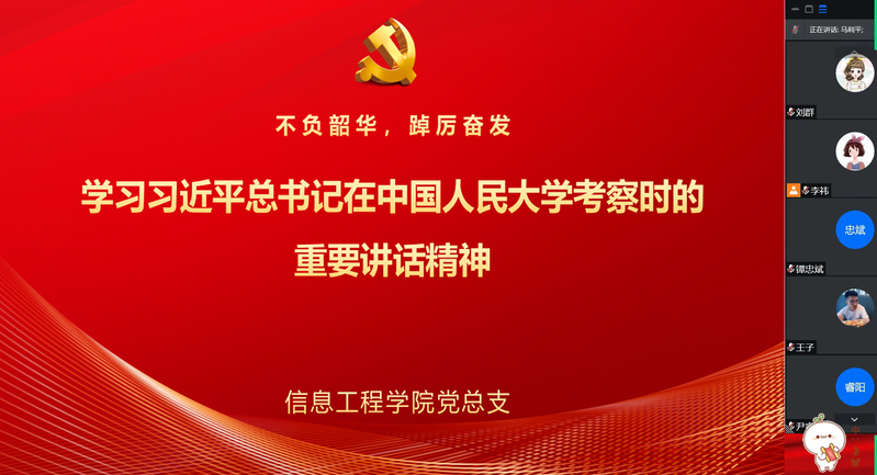 5月6日晚上19:00,信息工程学院党总支通过线上腾讯会议组织师生党员共同学习习近平总书记的重要讲话精神并展开深入讨论,习近平总书记重要讲话精神在师生党员中引发热烈反响,大家纷纷表示将更加坚定不移听党话、跟党走,在实现中华民族伟大复兴的时代洪流中踔厉奋发、勇毅前进。