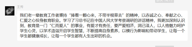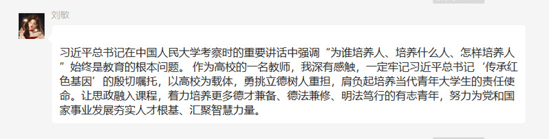 副校长罗宁发表感悟,习近平总书记在中国人民大学考察时的重要讲话高屋建瓴、思想深邃、内涵丰富,为我们落实立德树人根本任务、加快建设特色鲜明的高水平职业本科大学指明了前进的方向。我们要坚持和加强党对高校的全面领导,以党的政治建设为统领,构建学校高质量的党建工作体系。要坚持教育者先受教育,让有信仰的人讲信仰,把教师作为学校发展的第一资源。要进一步加强青年爱国主义教育,引导青年学生坚定不移听党话、跟党走,培养堪当民族复兴大任的时代新人。作为一名党员,自己将始终坚持用习近平新时代中国特色社会主义思想武装头脑,发挥党员先锋模范作用。