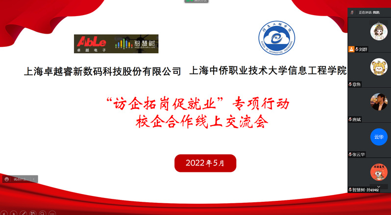 为认真贯彻落实党中央、国务院关于高校毕业生就业工作的决策部署,全面深化校企合作、为毕业生开拓更多就业创业岗位和机会,促进毕业生高质量就业。信息工程学院访企拓岗促就业专项行动校企交流会,于5月12日在线上举行,线上走访了上海卓越睿新数码科技股份有限公司。