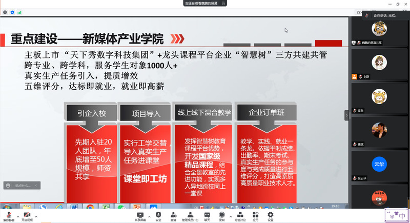 参与本次会议的企业方领导有智慧树网副总裁王欣,智慧树网上海省区总监孙峥嵘,智慧树网HRBP周文颖,课程总监饶蕾,客户经理朱洪吉。院方领导有信息工程学院院长赵欣,副院长魏鹏,教学副院长袁明,党总支书记刘群,副书记唐斌,数媒专业主任王奕,院办主任李祎以及数媒专业辅导员老师。会议由副院长魏鹏主持。