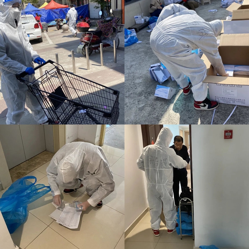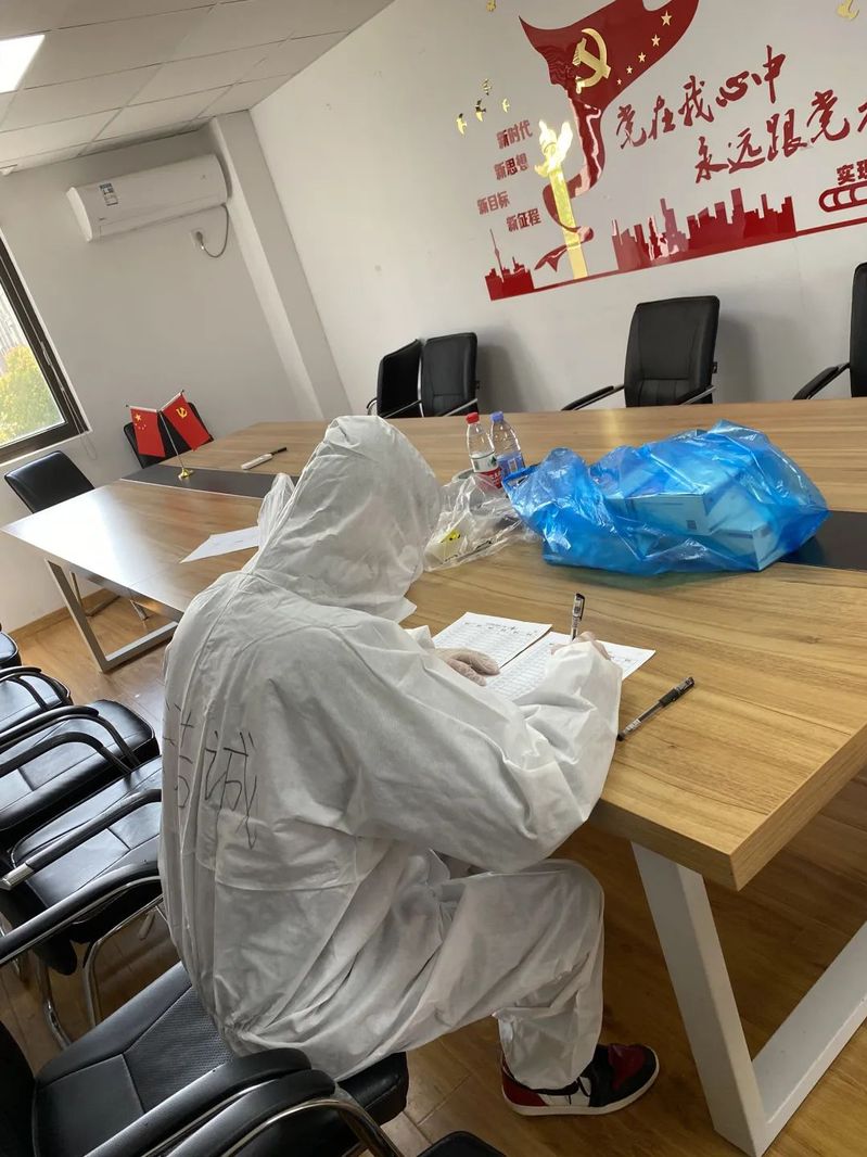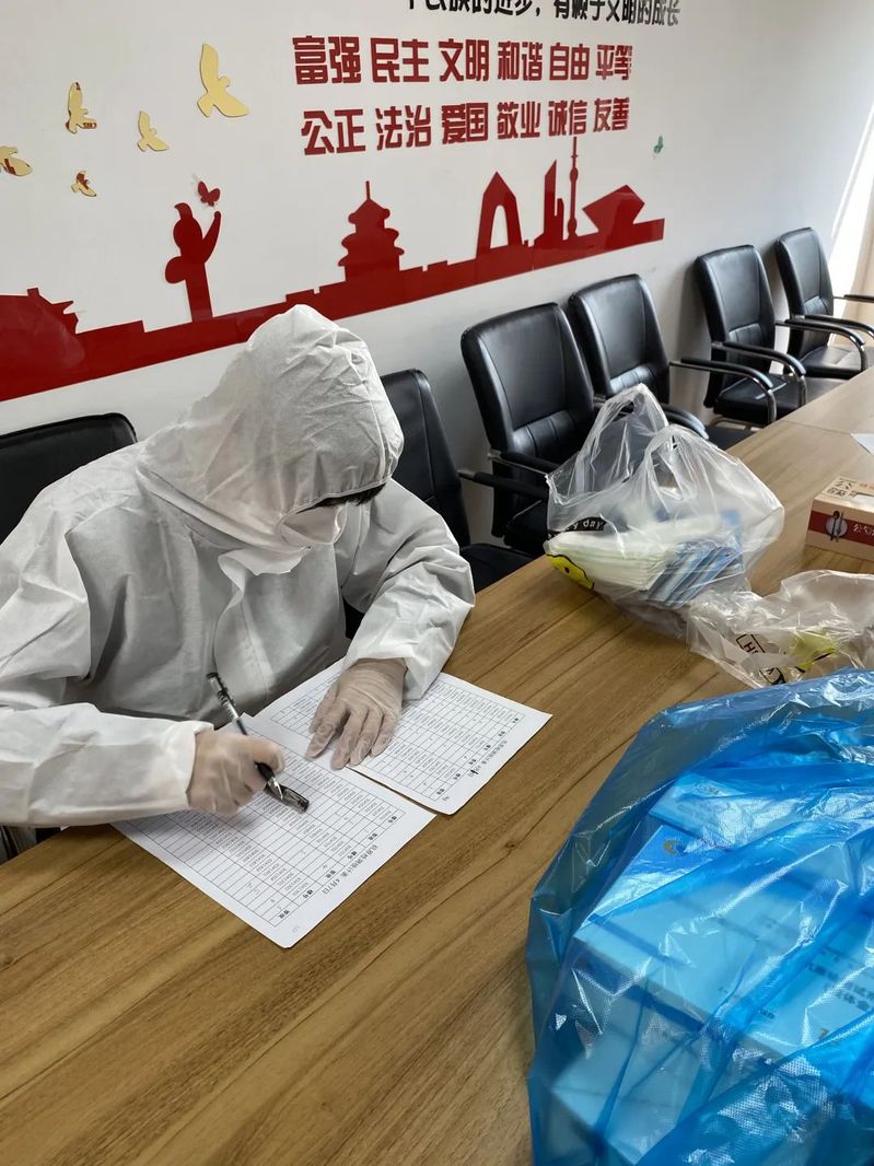 当我穿上防护服的那一刻,我感到无比自豪。发放抗原,我要先去居委会领取抗原检测试剂盒,清点数量,核对发放名单:哪户有人住,有多少人。确认数量和名单一致后就去楼道发放,电梯乘坐到顶楼,拿出抗原检测试剂盒里面的试剂盒、试剂管、试剂袋、试剂棉签,每样数好核对好数量后,再敲门发给居民手中,让他们做好还要回收。一层楼发好后去下面一层楼发放,发放好后回收核对是不是阴性。有些居民没有及时做抗原的,还要提醒他们。全部好了以后把发放名单和回收好的检测试剂工具交到居委会,结束后脱下防护服已是浑身汗了。志愿者的工作是辛苦的,但比起那些日夜奋战在一线的医护人员那是不值一提的。我要向他们学习,坚持不懈,共克时艰,打赢这场疫情保卫战。