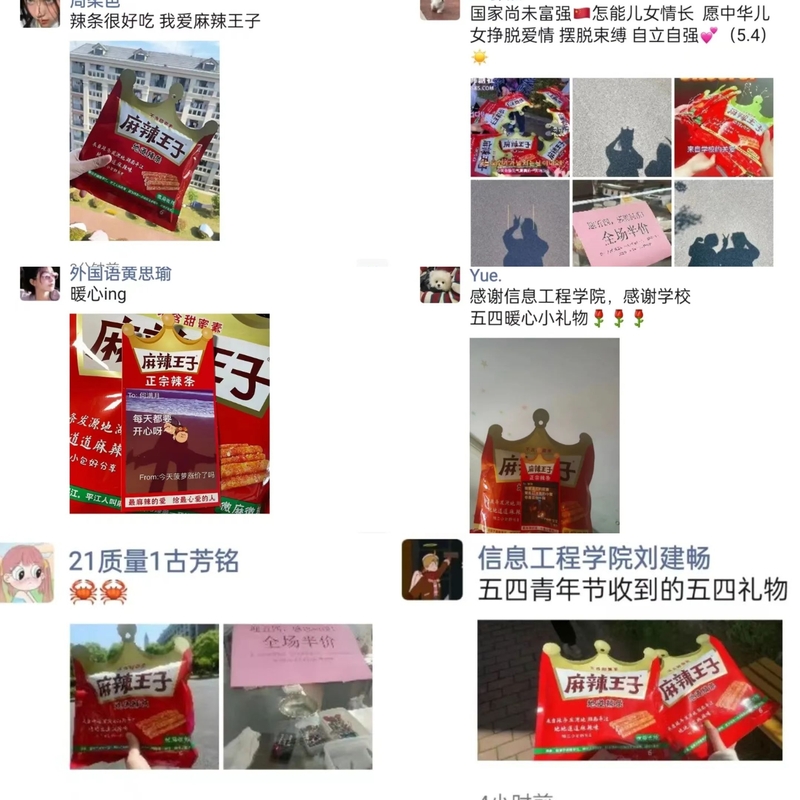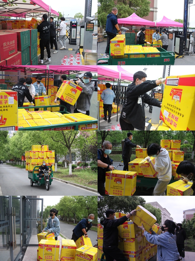 在五四青年节,我们收到了麻辣王子捐赠的物资,学院志愿者将物资进行消杀搬运进校园里并搭起桌子,一人一包分发给每一位在校的同学。许多同学收到后,非常激动纷纷发了朋友圈,感谢麻辣王子送来的这份爱。