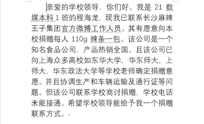 近期,我校收到了麻辣王子送来的物资,因疫情原因,麻辣王子官方微博表示愿意帮助上海高校所有在校学生捐赠物资。我院21数媒本科1班程海龙,看到消息后第一时间联系了麻辣王子的官博和学校领导。