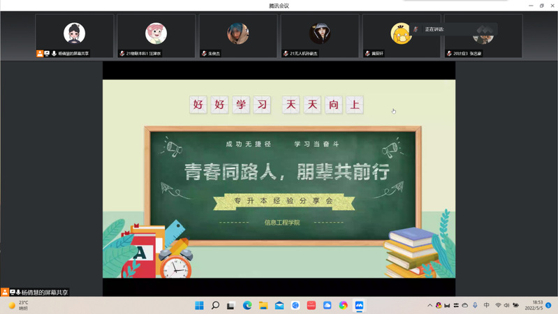 为了满足同学们继续深造的梦想,帮助有升学意愿的同学借助朋辈之力做好规划,实现升本梦想。信息工程学院在5月5日晚6:30召开线上专升本经验分享会,由信息工程学院执行主席杨倩慧同学主持,近百位入党积极分子积极参加。