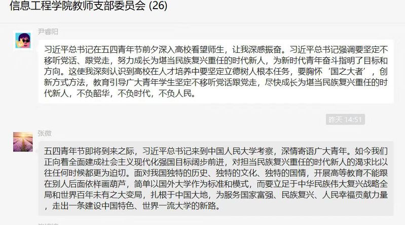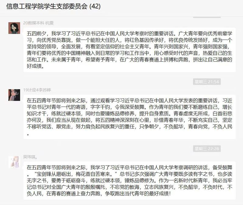 5月6日晚上19:00,信息工程学院党总支通过线上腾讯会议组织师生党员共同学习习近平总书记的重要讲话精神并展开深入讨论,习近平总书记重要讲话精神在师生党员中引发热烈反响,大家纷纷表示将更加坚定不移听党话、跟党走,在实现中华民族伟大复兴的时代洪流中踔厉奋发、勇毅前进。